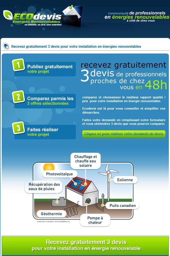 Recevez gratuitement votre devis de panneaux photovoltaïque, d'éolienne, de pompe à chaleur, de chauffe eau solaire, de géothermie, d'isolation, de puits canadien, de récupération eau de pluie ...etc de la part de professionnels les plus Proche de votre domicile..